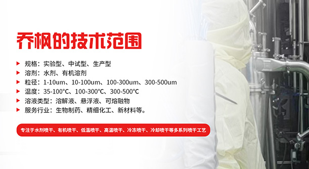 上海喬楓實業有限公司,成立于2012年,是從事噴霧干燥設備的研發設計、生產、銷售(小型噴霧干燥機實驗型噴霧干燥機,35℃低溫噴霧干燥機,有機溶劑噴霧干燥機低溫閉式循環噴霧干燥機、超細粉末噴霧干燥機、噴霧冷凍干燥機真空噴霧干燥機、氣流噴霧干燥機,噴霧造粒干燥機離心噴霧干燥機,沸騰制粒機等)和售后于一體的綜合性公司,本公司現成為一家致力于為生物制藥、精細化工、新能源、陶瓷造粒及食品工程等領域提供全套解決方案的整線交鑰匙工程企業。